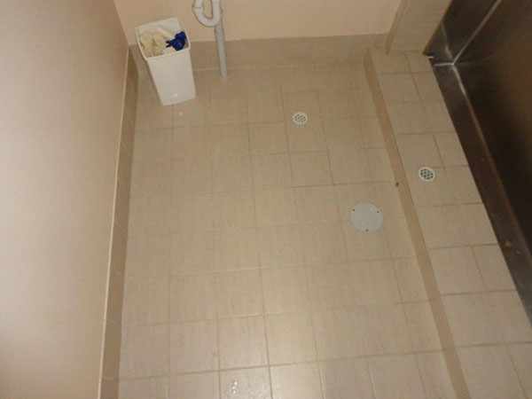 | Public restroom tiles & grout with dark, built up grime |